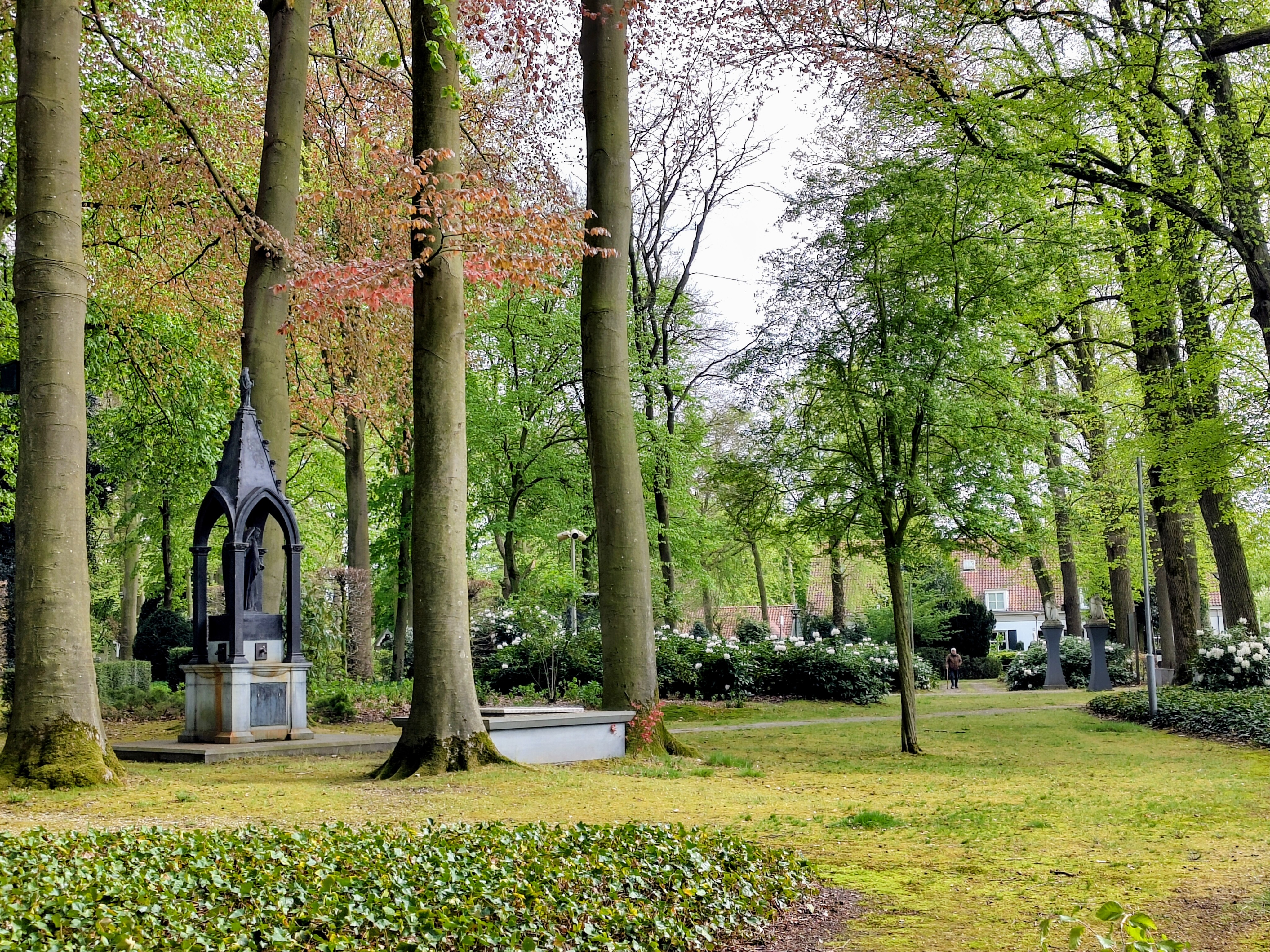 Op naar buiten! Bomen groeien buiten Joris, dus daar moet je zoeken. Achter de kerk is een groot processiepark verrezen. Het park doet wat aangeharkt aan maar de vele volwassen bomen geven het wel een rustige en serene sfeer. Ik weet dat de oude meidoorn ooit naast de Heilige Put stond. Deze bron is net als de boom gekerstend en is getooid met een neogotisch bouwwerkje met hierin een menshoge engel met in de top een kopie van Onze-Lieve-Vrouw van Handel. Niets is meer wat het lijkt. Teleurgesteld druip ik af. Dan, als een wonder sta ik ineens oog in oog met een lieflijk boompje. Ik had haar helemaal over het hoofd gezien. Nu de ondergaande zon haar laatste stralen tussen de eiken en beuken laat stralen zie ik haar bloeien.